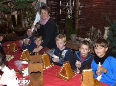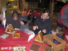 Birte Siercks und Inke Jacobs hatten alles bestens vorbereitet. Lebkuchenwände, Zimststerne, Gummibärchen, Lebkuchen mit Zuckerguss drauf, Schoko-Dominos, Smarties – alles lag portionsgerecht bereit. Die Kinder mussten nur noch zugreifen und konnten bauen. Den kleineren halfen dann Mütter und auch Väter (!) bei der Verzierung mit Zuckerguss aus den Spritztüten. Aber die Kinder hatten das Sagen, wohin die Tupferchen kommen sollten.