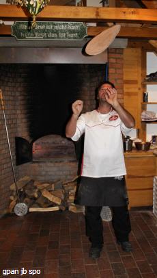 Tauwetter war angesagt. So konnte man sich wieder an die frische Luft wagen, ohne auf Eis und Schnee auszurutschen. Am Backhus sorgte das vorgebaute Zelt mit seinen Gasbennern für gemütliche Wärme, die aber auch aus dem Backhus herauströmte, denn der "Jongleur" Pasquale hatte die Backofentür aufgelassen. Seinen Pizzateig knetete und rollte er ausführlichst um ihn dann mit kreisenden Bewegungen in die Luft zu schleudern, damit er schön gleichmäßig dünn wurde.