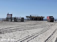 Die Glaswand der Terasse steht noch. Das Restaurant wurde abgerissen. Viele Pfähle wurden zusätzlich eingespült, so dass die Plattform in Richtung Strand sich vergrößert hat.