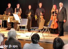 W. Domann (re) bedankt sich beim Tilia-Quartett - und dem Klarinettisten Tibor Reman
