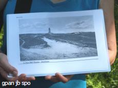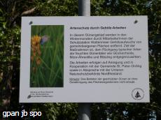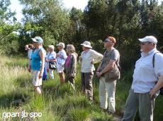 Den ersten Blick der Gruppe lenkte Sabine Gettner auf ein feuchtes Dünental, hinter dem Gelände des Ev. Jugenderholungsdorfes gelegen. Ein Schild mit dem Bild eines Bläulings auf der Moor-Ährenlilie weist hier auf die durchgeführten Arbeiten hin.