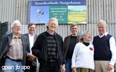 Zur Strandkorbhalle Hungerham? Immer den Autos nach! So hätte man den Weg für jemanden beschreiben können, der zur Vernissage der 2. Ausstellung der Kunstinitiative St. Peter-Ording wollte. Annähernd dreihundert Gäste hatten sich bei - lang entbehrtem - Sonnenschein am Deich in Ording eingefunden. Begrüßt wurden sie von der Band „Jug Water“ mit einprägsamer Gitarren- und Mundharmonikamusik. Thomas Bartram, Vorsitzender der Kunstinitiative, freute sich über die zahlreichen Besucher, dankte der Tourismuszentrale für den guten Zustand der Strandkorbhalle und auch den Sponsoren, die diese Ausstellung unterstützt haben. „Wenn man diesen Raum mit Kunstwerken füllt, vollzieht sich das eigentliche Wunder.“ Dabei bedankte er sich besonders bei Frauke Petersen, die ihre große Erfahrung für die Hängung der Bilder und das Aufstellen der Skulpturen beisteuerte. Bürgervorsteher Boy Jöns, der auch im Namen des Tourismusdirektors und Bürgermeisters Rainer Balsmeier die Grußworte der Gemeinde überbrachte, bedauerte, dass die Gemeinde keine eigene Galerie habe, freue sich aber hier eine Sommergalerie in der Gemeinde vorzufinden. Wir leben nicht nur von unserer Mühe und Arbeit, „wir leben eben auch von den schönen Dingen.“