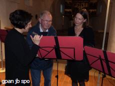 So begann die musikalische Reise dann auch mit drei Madrigalen von Orlando di Lasso (1532 – 1594) und endete mit Quartett 1988 von Harald Genzmer (1909 – 2007). Vorgewarnt von Heinke Hennings auf Ungewohntes – „Da müssen Sie jetzt durch.“ - in dessen drei Sätzen Andante – Tranquillo – Giocoso war die moderne Musik durchaus gut aushaltbar anzuhören. Oder lag es einfach daran, dass die Zuhörerschaft durch die Auswahl der meist kürzeren schnellen Stücke mit den Epochensprüngen über Frescobaldi, Scarlatti, Kuhlau, Tschaikowski, Max Reger und Eugène Bozza auf immer Neuartiges vorbereitet worden waren? Es lag wohl wesentlich an der Kunstfertigkeit der vier Flötistinnen, den gekonnt vorgetragenen solistischen Teilen, dem variablen Zusammenspiel von einer Flöte mit den anderen drei oder anderen Kombinationen und nicht zuletzt der Freude und Begeisterung für das Spielen. Das spürte das Publikum und dankte mit herzlichem Applaus.