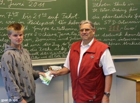 Walter Petersen, Vors. des SPD-Ortsvereins, überreicht 500 Euro an die Förderklassen