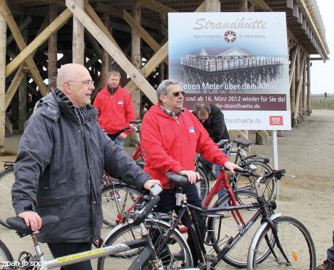 Torsten Albig, Spitzenkandidat der SPD-Schleswig-Holstein, und Stefan Runge, Landtagskandidat, freuten sich am Donnerstag, 12. April 2012, auf eine Fahrradtour durch St. Peter-Ording. Treffpunkt war der Marktplatz, auf dem um 10 Uhr 30 schon etliche Radwanderer auf die beiden warteten. Stefan Runge traf als erster ein, ihm folgte Torsten Albig kurz darauf. An das Rad von Torsten Albig wurde noch eine Kamera installiert, die ihn während der Tour immer im Visier hatte. Torsten lachte: "Was wollt Ihr? Soll das ein abendfüllender Film werden?"