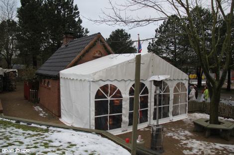 Tauwetter war angesagt. So konnte man sich wieder an die frische Luft wagen, ohne auf Eis und Schnee auszurutschen. Am Backhus sorgte das vorgebaute Zelt mit seinen Gasbennern für gemütliche Wärme, die aber auch aus dem Backhus herauströmte, denn der "Jongleur" Pasquale hatte die Backofentür aufgelassen. Seinen Pizzateig knetete und rollte er ausführlichst um ihn dann mit kreisenden Bewegungen in die Luft zu schleudern, damit er schön gleichmäßig dünn wurde.
