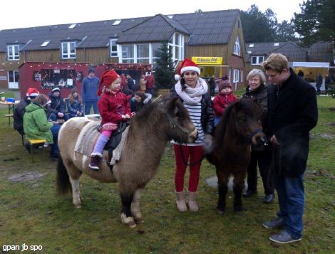 So präsentierte sich dann Sonnabend und Sonntag das Winterdorf und sein Weihnachtsmarkt den vielen kleinen und großen Gästen. Die schlenderten an den Hütten mit ihren Ständen, den aufgestellten Tannenbäumen und einigen Strohballen vorbei, schauten, verweilten plaudernd und wärmten sich von innen. Es gab nicht nur Bratwürste und Glühwein. Auch Milchreis und Erbsensuppe waren im Angebot, selbstverständlich Crepes, Futjes und Waffeln. Sogar an Bratäpfeln konnte man sich laben. Wärmende Getränke wie Kinderpunsch und Glögg trugen zum Wohlbefinden bei. Die Standbetreiber auf dem Gelände draußen sorgten so für ein buntes Bild, unter ihnen der Abi-Jahrgang der Nordseeschule, das Jugendzentrum und die Fußball-Mädchen des TSV sowie andere Vereine und von der Idee des Winterdorfes angelockte private neben auch kommerziellen Anbietern. Plätzchen, Süßigkeiten, verschiedene Weihnachtsartikel und sogar „Gesundheit zum Verschenken“ konnte man erwerben. Wer noch einen Weihnachtsbaum suchte, hatte hier dazu die Auswahl in geeigneten Größen. Zwei Ponys aus dem Westküstenpark standen bereit zu einem Ritt über das Gelände.