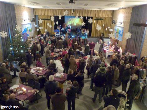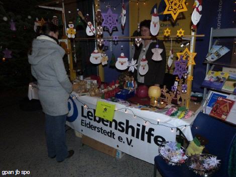 Ebenso lud die Aula zum Besuch ein und zeigte sich festlich geschmückt mit einem Weihnachtsbaum in der Nähe der Kaffeetische und mit Lichtergirlanden an der Empore. Zwei Diagonalreihen von Schneeflocken und Sternen zauberten Adventsstimmung im Zusammenspiel mit den verschiedenen Ständen. Da wurde Wolle gesponnen. Gläser wurden verziert. Mit Brandmalerei wurden persönliche Geschenke geschaffen. Es gab Schaffelle zu kaufen, Wolliges, Gestricktes und Gehäkeltes, was Besonderes zum Anziehen, Schmuck unterschiedlichster Art, Marmeladen und Säfte, Weihnachtskarten, selbst Gebasteltes und vieles mehr, darunter die friesische Weihnachtskugel 2012 mit dem Schafmotiv. Es war ein echter weihnachtlicher Markt bei Beteiligung der St. Christian Diakonie Garding mit ihren verschiedenen Einrichtungen und dem Ortsverein St. Peter-Ording des DRK.
