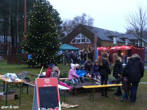 Mitten auf dem Gelände des Jugenderholungsdorfes in der Pestalozzistraße erstrahlte ein wunderschöner großer Weihnachtsbaum im Lichterglanz. Rundherum standen mit Tannengrün und Lichterketten adventlich herausgeputzt die vielen zumeist dunkelroten Holzhütten. Auf der Rasenfläche mit den verbliebenen Schneeresten der vergangenen Wintertage waren um ein Holzfeuer in einer Eisenwanne Bänke aufgestellt. Auf ihnen saßen Kinder und Jugendliche begeistert und fleißig beschäftigt, über der Glut ihr Stockbrot zu backen. Gleichzeitig konnten sie dabei die abstrahlende Wärme an diesem feuchtkalten dritten Adventswochenende genießen.
