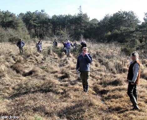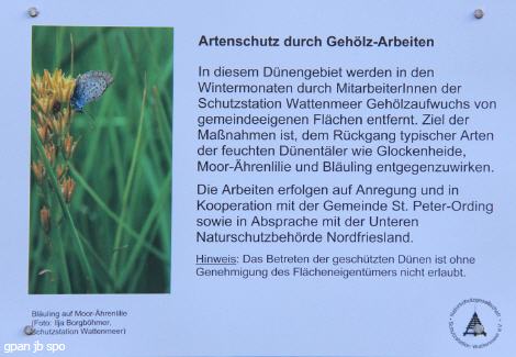 „Ich will etwas Nützliches tun. Hier kann ich die Feuchtwiesen und damit seltene Pflanzenarten erhalten.“ Martha Koelling verbringt ihr BFD (Bundesfreiwilligendienst) – Jahr auf Föhr und ist für dieses Wochenende nach St. Peter-Ording gekommen. „An die Temperaturen gewöhnt man sich!“, sagt sie lachend. Heute scheint die Sonne auf dieses Feuchtdünental. Sina Pünger aus Baden-Württemberg leistet ihr freiwilliges ökologisches Jahr (FÖJ) bei der Schutzstation Wattenmeer in St. Peter-Ording ab. „Hier ist es wunderschön, ich erlebe die Jahreszeiten hautnah, draußen bei den Führungen durch das Watt, durch die Dünen oder bei der Vogelzählung. Alle Jahreszeiten bei jedem Wetter!“ Und ihr gefällt das gemeinsame Arbeiten mit den anderen Jugendlichen. Dass sie genau wissen, warum sie hier die Birken auf etwa ein Meter Höhe absägen, die Kiefern tief absägen oder die Erlen stehen lassen, dafür sorgte auch die Diplom-Biologin Sabine Gettner, Geschäftsführerin des FÖJ-Trägers in Husum. Sie hat diesen Einsatz gemeinsam mit der unteren Naturschutzbehörde Nordfriesland und der Gemeinde St. Peter-Ording organisiert. Die Mitarbeiter des Bauhofes haben schon größere Bäume gefällt und jetzt sind die Jugendlichen dabei, Äste und Zweige über die kleinen Gräben springend aus dem Tal zu ziehen. Bis Ende Februar wollen sie in dem Feuchtdünental fertig sein. Die Maßnahmen sollen dazu beitragen, dass typische Arten dieses seltenen Biotops wieder eine Chance bekommen, sich auszubreiten. Da ist zum Beispiel der „Beinbrech“, der dort wächst, wo man sich ein Bein brechen kann, nämlich dort, wo man von Pflanzenbüschel zu Pflanzenbüschel springen muss, um keine nassen Füße zu bekommen. Der „Beinbrech“ ist die gefährdete Moor-Ährenlilie, in schönen gelben Blütentrauben blühend, die wiederum den Bläuling, einen Schmetterling, anzieht. An feuchten Stellen blüht auch die Glockenheide (Erica tetralix). Landesweit vom Aussterben bedroht ist der blau blühenden Lungenenzian. Sabine Gettner hofft, dass sich auch der Mittlere Sonnentau wieder ansiedeln könnte, der hier Ende der 90er Jahre noch wuchs, aber inzwischen verschwunden ist.