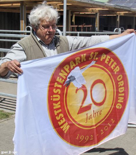 Peter Marke entfaltete später ein Banner, das auf das zwanzigjährige Bestehen des Westküstenparkes hinweist.