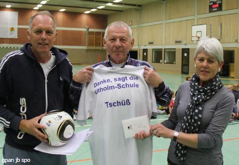 Am vorletzten Schultag vor den Herbstferien verabschiedete die Utholm-Schule ihren langjährigen ehrenamtlichen Mitarbeiter Michael Brucherseifer. Seit 2004 wirkte er als Schulmediator, Begleiter auf Klassenfahrten, half beim Kiosk, spielte mit den Schülern Floorball und Fußball. Er war verantwortlich für das Fördertraining der Fußball-AG der Utholm-Schule, der Regionalschule und des Nordseegymnasiums und erreichte mit seinen Schülern zahlreiche Erfolge. Stolz trug seine Fußball-AG neue Trikots. Brucherseifer hatte zwei Eltern, Ferdinand Wieck und Britta Niehus-Düber, angesprochen und die erklärten sich bereit über ihre Firmen die neuen Trikots zu spenden. Vor den Schülern musste „ihr Trainer“ natürlich noch sein Können unter Beweis stellen und den Fußball ins obere rechte Toreck köpfen und den Ball mehrmals „ ins Tor versenken“. Schulleiter Boy Möller und Konrektorin Frauke Hansen dankten ihm für seine ehrenamtliche Arbeit.