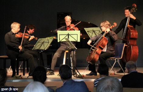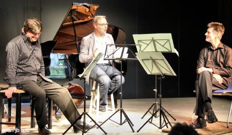 Am Sonntagvormittag war das Dünen-Hus nur schwach besetzt. Dennoch führte Professor Noltze wieder ein lockeres, heiteres Vorgespräch mit dem Bassisten Peter Schmidt und dem Cellisten Sven Forsberg, an dem das Publikum seine Freude hatte. Franz Schuberts (1797-1828) einziges Klavierquintett, als Forellenquintett bekannt, verlangt die unübliche Besetzung Pianoforte, Violine, Viola, Violoncello und Kontrabass. Dadurch dass der Bass manche Teile des Cellos übernimmt, werden dem Cello mehr singende, melodische Funktionen überlassen. Forsberg schmunzelnd: „Es sind keine ‚Handschellen‘ mehr da!“ Schmidt freute sich denn auch augenzwinkernd auf seinen „Solopart“ als Bassist im vierten Satz von Schuberts Forellenquintett.