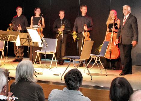 W. Domann (re) bedankt sich beim Tilia-Quartett - und dem Klarinettisten Tibor Reman