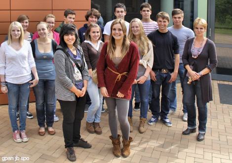 Die spanischen und deutschen Schüler vor der Nordseeschule mit ihrer sie betreuenden Lehrerin Marion Wolf (re)