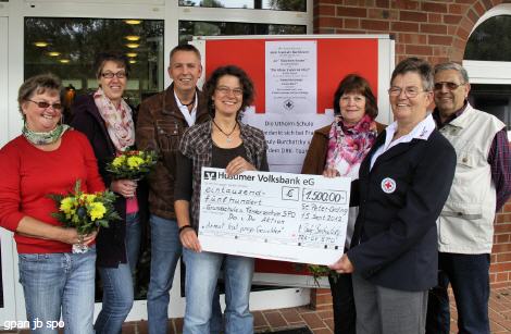 Schröder legte noch 200 Euro obendrauf, so dass Marlene Pauly-Burchatzky stolze 1.500 Euro an Frau Gaby Bombis vom Elternbeirat der Grundschule mit Förderzentrum übergeben konnte. Anlass für das DRK-Team war wieder die bundesweite DRK- Aktion „Armut hat junge Gesichter“. Schon im letzten Jahr engagierten sie sich dafür und übergaben 1000 Euro an die Utholm-Schule, einer.