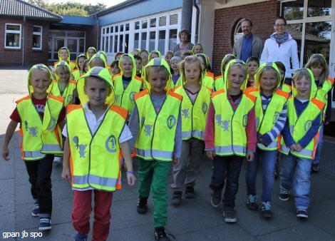 Jetzt kann’s losgehen! Die Erstklässler der Utholm-Schule erhielten ihre Sicherheitswesten für den Schulweg und wollten sogleich damit loslaufen. . „Die Benutzung der Sicherheitsweste soll so selbstverständlich werden wie ein Fahrradhelm!“ wünschen sich die Spender, die ADAC-Stiftung „Gelber Engel“ mit ihren Partnern Deutsche Post und „Ein Herz für Kinder“. 750 000 Sicherheitswesten werden in diesem Jahr in ganz Deutschland verteilt. Schon zwei Mal hatte Elternvertreter Dr. Horst Laube versucht, die Utholm-Schule auf die Liste der teilnehmenden Schulen zu setzen. Er freute sich mit den Lehrerinnen Ragna Bertholdt und Julia Pastoor, dass es nun beim dritten Mal klappte. Mit den Sicherheitswesten sind die Kinder bis zu 150 Meter weit in der Dämmerung zu sehen. Die Westen bieten also ein unbezahlbares Plus an Sicherheit. Sie sind zudem noch mit einer Kapuze ausgestattet, auf der Vorder- und Rückseite sind die beiden Verkehrsdetektive „Frieda & Felix“ als leuchtende Figuren aufgedruckt. Mit diesen cleveren Spürnasen, bekannt auch durch das Verkehrsquiz in der ADAC-Motorwelt, sollen sie gefährliche Situationen auf ihren Wegen aufspüren und mit ihnen umgehen lernen oder meiden. Da jährlich in Deutschland etwa 30 000 Kinder verunglücken, ist es wichtig, dass Kinder im Straßenverkehr sowohl tagsüber als auch bei Dunkelheit gut zu erkennen sind.