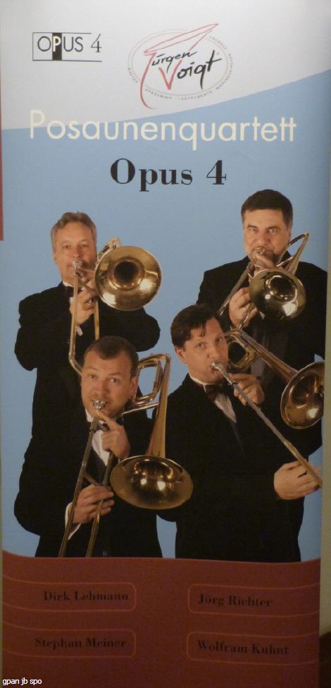OPUS 4 wurde 1994 gegründet. Von den Gründungsmitgliedern sind noch dabei Jörg Richter (Sopranposaune – Fa. Syhre, Leipzig; Alt- und Tenorposaune – Fa. Ed. Kruspe), Leiter des Quartetts, Moderator bei Konzerten und auch sonst „Mann für alles“, sowie Dirk Lehmann (Tenorposaune – Fa. Ed. Kruspe). Stephan Meiner (ebenfalls Tenorposaune – Fa. Ed. Kruspe) und Hans-Martin Schlegel (Bassposaune – Fa. Ed. Kruspe) - in Vertretung für das vierte Ensemblemitglied Wolfram Kuhnt - vervollständigten das Quartett beim Auftritt in St. Peter-Ording.