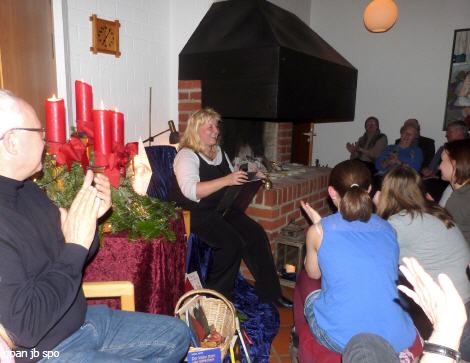 Zum 20. Mal gab es nun „Gedichte und Geschichten“ um Weihnachten mit seinen Vorbereitungen auf das Fest, Essen und Geschenken und Erinnerungen an alte Zeiten. Theologische Anmerkungen und Botschaften fehlten ebenfalls nicht, aber sie waren so fein wie die schönsten Weihnachtsgeschenke verpackt. Dazu gab es nach dem ersten Abschnitt Teepunsch und Glühwein (ohne Alkohol) und nach dem zweiten Teil dann Bratäpfel, frisch zubereitet im Backofen in der Küche nebenan. Der Duft von Weihnachten zog in die Nasen und machte die Herzen weit und fröhlich.