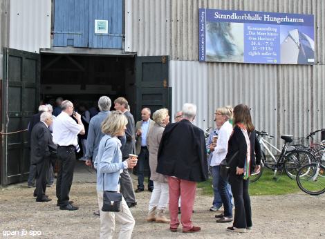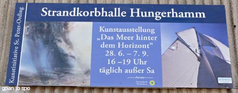 Spannend war die Eröffnung der dritten Kunstausstellung in der Strandkorbhalle Hungerhamm in Ording. Dieses Mal hieß es für fünf Künstler: „Das Meer hinter dem Horizont.“ Die Kunstinitiative St. Peter-Ording (KISPO) hatte dazu eingeladen. Alles war vorbereitet. Die Bilder waren gehängt, die Skulpturen standen an ihren Plätzen, Sitzgelegenheiten waren vorhanden, für Kaffee und Kuchen und weitere Getränke war gesorgt, das Wetter bestens. Und die Besucher kamen zahlreich, zu Fuß, mit dem Fahrrad und auch mit dem Auto, damit zum Teil von weiter her.