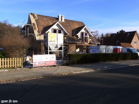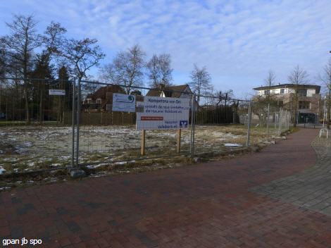 Über die Ostlandstraße fahre ich in die Dorfstraße. An der Ecke Schräggeest war das Haus entkernt worden und befindet sich im Wiederaufbaustadium. Ein Stückchen weiter gegenüber dem Kinderspielhaus werden nach Abriss demnächst zwei Reihenhäuser entstehen.
