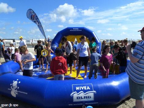 Unter dem Motto „Wir machen wasserfest“ war das ehrenamtlich tätige 16-köpfige DLRG/Nivea Strandfest-Team von jungen Frauen und Männern zum Bergfest ihrer Strandtour an 40 deutsche Seebäder nach St. Peter-Ording gekommen. Zuerst ging es für die Kinder auf Entdeckertour. An den verschiedenen Spielstationen erfuhren sie zusätzlich Wissenswertes. Begierig beantworteten sie auf ihrer Tour auch die Fragenkarten, die in eine Schatztruhe gegeben wurden. War alles richtig, gab es möglicherweise einen Preis zu gewinnen. Seehund „Nobbi“ war erst auf dem Strandfestplatz unterwegs, um dann später beim Puppentheater gemeinsam mit der DLRG-Puppe „Nils“ Wissen über Gefahren beim Baden zu vermitteln. Moderatorin Laura motivitierte die Kinder so, dass sie dabei begeistert mitmachten. „Nils“ musste sich so manches anhören. Im Gegensatz zu ihm wusste nämlich die 4jährige Pauline, was die „Rote Fahne“ am DLRG-Mast bedeutet.