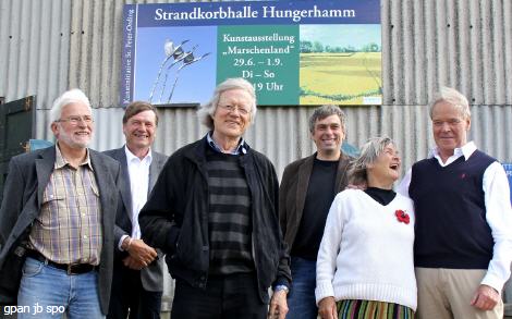 Thomas Bartram stellte dann die einzelnen ausstellenden Künstler vor. Bei Gisela Mott-Dreizler, die seit zwanzig Jahren auf Eiderstedt lebt und die mit drei Bildern vertreten ist, hob er deren fröhliche Farbigkeit und Ausdrucksstärke hervor. Ein Bild hat sie mit dem Gedicht „In der Ferne“ von Günter Kunert verbunden, in dem er am Ende über das Marschenland schreibt: „Hier heißen die Flecken auf der Landkarte „Kotzenbüll“ und „Witzwort“, ohne dass einer lacht.“ Die Bilder von Raimund Behrend wirken auf ihn, als wären sie bei Vollmond gemalt. „Die Nacht hat aus der Landschaft die Farben herausgesogen … auch hier der weite Horizont, der hohe Himmel, die dramatischen Wolken!“ Der „waschechte Eiderstedter“, Dieter Staacken, setze mit seinen Schwarz-Weiß-Bildern die Marsch liebevoll und differenziert ins Bild. Seine Bilder seien beseelt durch einen Rhythmus, der auch in seiner Lyrik eine große Rolle spiele. Mit Thomas Freund habe man einen „Draußenmaler“ gewinnen können, der noch mit seiner Staffelei in der Landschaft anzutreffen sei. Seine Farben verraten, dass er lieber bei schönem Wetter male und zeigen so die farbige, fröhliche und beschwingte Seite der Marsch. Karin Dreyer, auch sie eine „Draußenmalerin“, lägen dagegen eher die dramatischen Wetterlagen. Ihre Aquarelle kämen kraftvoll und energiegeladen herüber. Die Skulpturen von Arne Prohn seien so platziert, dass sie mit den jeweiligen Bildern im Umfeld korrespondieren, so Bartram weiter. Alle Ausstellungsstücke seien für sich ein Kunstwerk, doch alle zusammen ergeben ein Gesamtkunstwerk, nämlich die Ausstellung „Marschenland.“