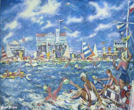 Blauer Himmel mit kleinen aufsteigenden und sich dann wieder rasch auflösenden Wolken. Ein nicht zu starker Wind, der für wehende Fahnen und kleinere Wellen sorgt. Eine kleine Badeinsel, ein Floß, weiter draußen, auf dem sich die Schwimmer ausruhen oder wieder mit neuem Elan ins Meer stürzen. Badende auf Luftmatratzen oder in Gummibooten, Jungen mit kleinen Segelbooten spielend, insgesamt ein buntes Gewimmel im Wasser! An der Flutkante sieht man die gestreiften Segel der Strandsegler und die hellen Strandkörbe, auch auf den Podesten.