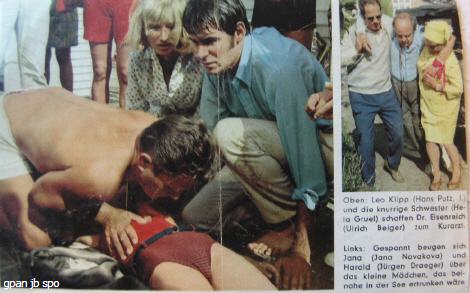 „Links: Gespannt beugen sich Jana (Jana Novakova) und Harald (Jürgen Draeger) über das kleine Mädchen, das beinahe in der See ertrunken wäre.“ - Der „behandelnde“ Bademeister ist Bruno Penz.